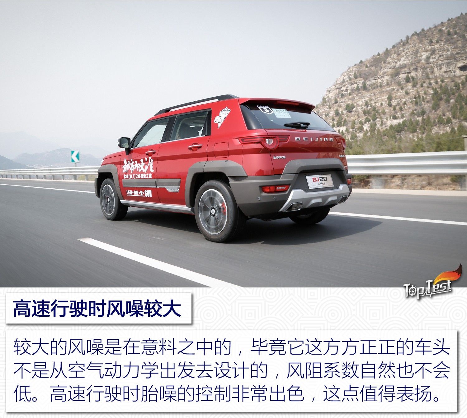 和不少价位相似的城市SUV相比,BJ20的风噪是偏大的,这从它方方正正的车身上也能猜到个大概了。不过,高速行驶时除了风噪较大以外,来自发动机和路面的噪音则被控制的比较得当,特别是胎噪,这或许是和四条静音性优秀的固铂CS4 TOURING轮胎有关。