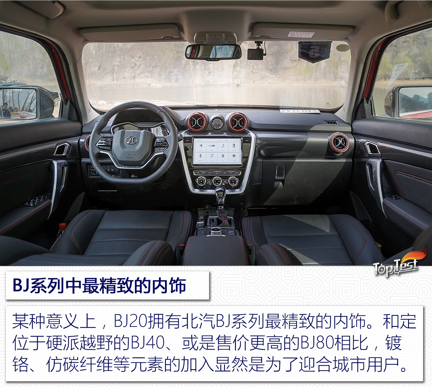 如果和同价位城市SUV相比,我想BJ20的内饰质感虽谈不上落后,但也达不到领先或是远超对手的水平。不过,如果在BJ系列内部去比较的话,BJ20的内饰就显得格外突出了。要知道,即便是价格贵出两倍的BJ80,车厢内还是带着些硬派越野车的粗犷,和BJ20这种按照SUV的标准来设计的内饰还是有观感上的明显不同。