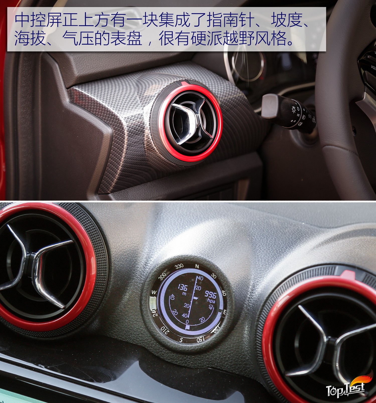 用料方面,在左右两侧的出风口,以及副驾驶前方的中控台区域,BJ20大面积的使用了如下图所示的仿碳纤维面板作为装饰,视觉效果还算不错。另外,在两个中央出风口之间,有一块集成了指南针、坡度、海拔、气压显示的液晶表盘,再次增添了不少硬派气息。
