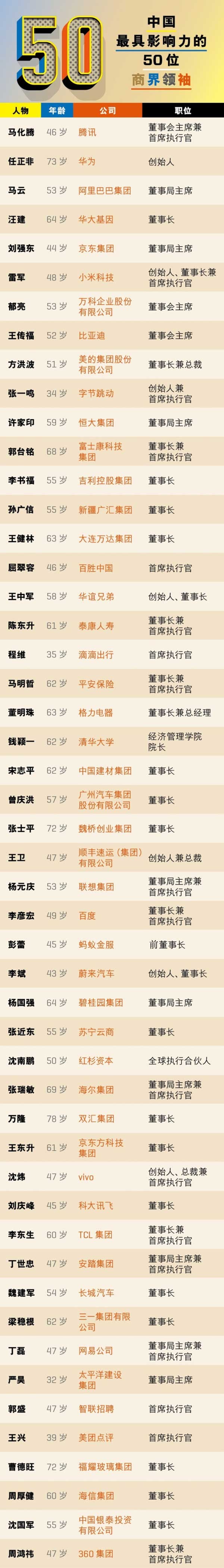 2018年《财富》(中文版)榜上的商业领袖,除了商业上的成就,在他们领导下产生的新技术、新产品、新模式和新思维等,都影响着人们的行为、经济和社会的发展;他们在事业上的创新和开拓,给成长中的企业家带来鼓舞和标杆;他们如何实现发展和转型,为管理者提供了重要的思路和启示。