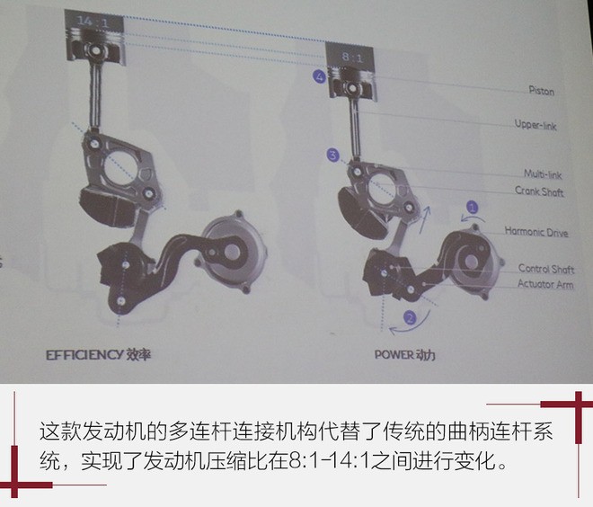 通常来说,一台发动机的压缩比是固定的、不可变的,而VC-TURBO的技术核心在于安装在活塞杆下方的可变行程杠杆机构,让这台发动机的排量可以在1970ml到1997ml之间进行变化,从而发动机的压缩比也发生变化,动力表现也就不一样。