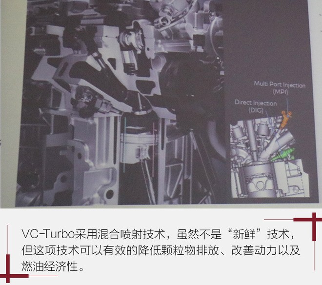 全新VC-Turbo发动机的直喷和缸盖一体化集成排气歧管,是催化转换器升温速度提高两倍,减少了排放,消除涡轮增压发动机升温慢的问题,同时直喷通过燃油加热和更好的雾化,产生更多动力。而多点喷射降低了冷启动时的燃油消耗,优化运行是燃油喷射量。从而减少排放,减小对空气质量的影响。