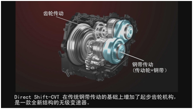这款变速箱是世界首台10速CVT变速箱。之所以叫“双传动”,是因为它是AT与CVT的创新整合,其将齿轮传动与钢带传动完美结合,可在两种传动之间自由切换,并以高效率及宽传动比范围,远超行业其他公司;其与2.0L“喷气流控发动机“合力”,称为“钻石动力组合”。简单点说,此台10速“双传动”CVT变速箱拥有“多”、“快”、“好”、“省”等特点。