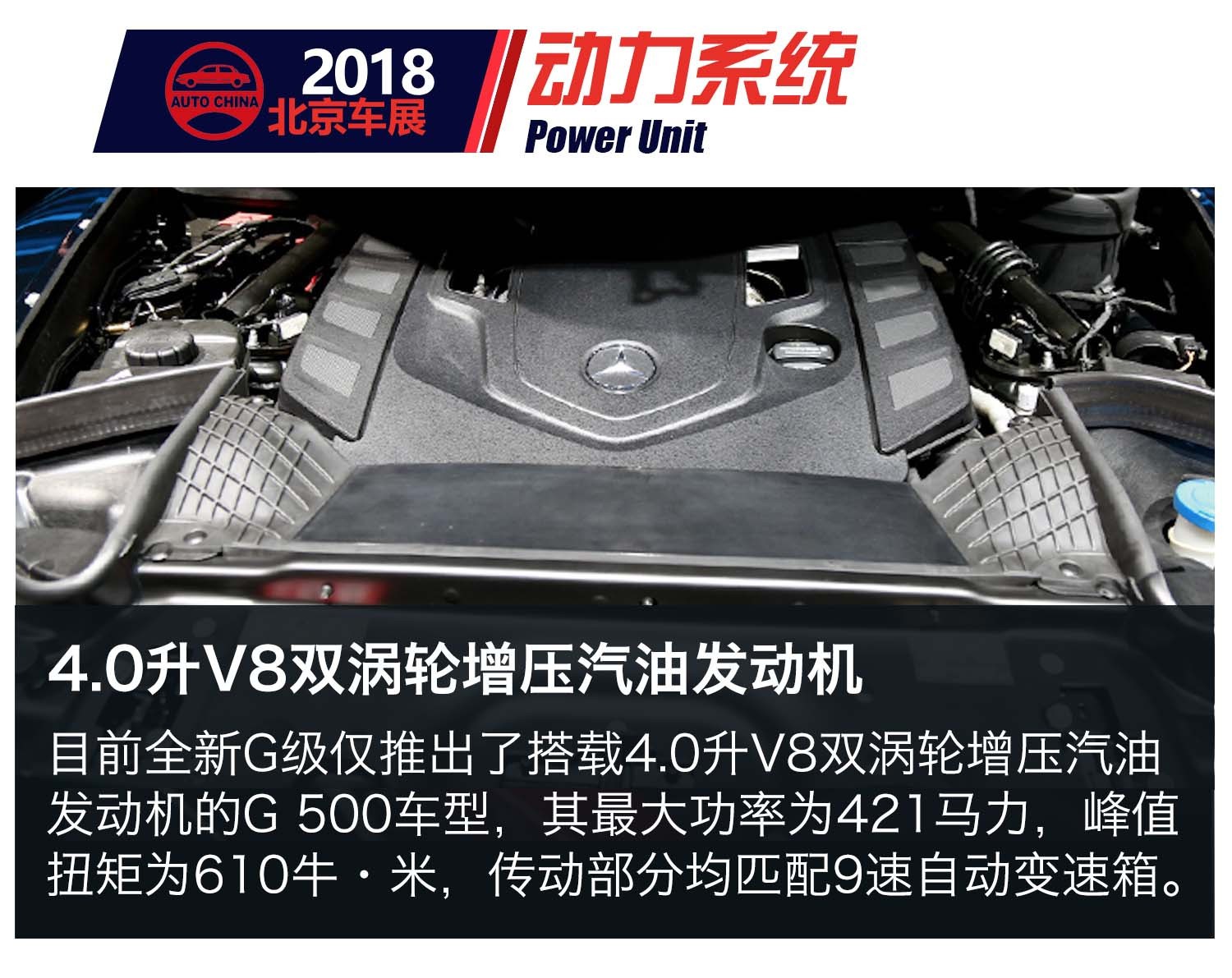 动力方面,目前全新G级仅推出了搭载4.0升V8双涡轮增压汽油发动机的G 500车型,其最大功率为421马力,峰值扭矩为610牛·米,传动部分均匹配9速自动变速箱。据悉,新车还将在今年晚些时候推出一款搭载3.0T汽油发动机和电动机组成的轻混动力车型、柴油版车型以及最大功率或达612马力的AMG G 63车型。