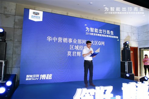 吉利汽车华中营销事业部莫君辉先生上台致辞,讲述吉利汽车的品牌内涵和不懈追求