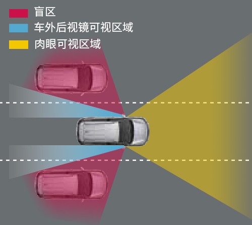 如图,图片中黄色区域是驾驶者在驾驶舱正常的视野范围,蓝色区域则是车外两侧反光镜视野范围。如果有车辆行驶在红色区域,驾驶者在不转头、只看后视镜的情况下,是无法察觉到的,这片红色区域就是反光镜盲区。紧不紧张!