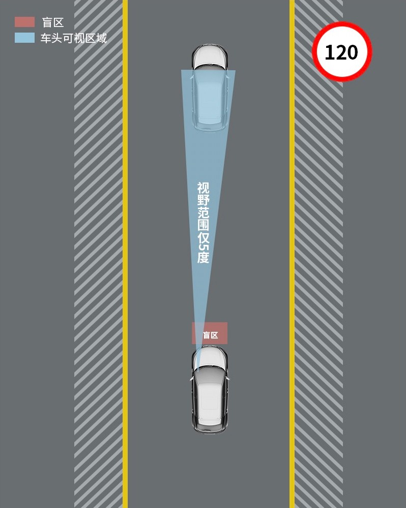 如图,当驾车调整到标准坐姿,由于引擎盖过高,或车头过长等原因,会造成前方视野存在“死角”。跟车行驶时,如果找不到最佳的安全距离,这麻烦就大了。在车辆高速行驶时,伴随速度提升,驾驶者的视野范围缩小。以120km/h的车速行驶,驾驶者视野范围仅为5°。