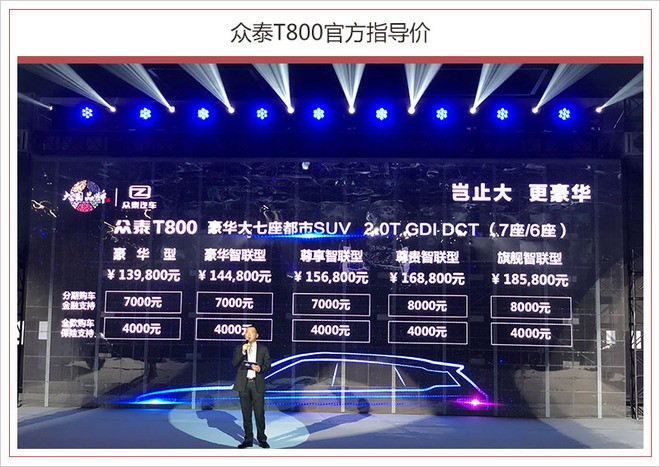 众泰T800还可享受分期购车金融支持和全款购车的保险支持,金额分别为7000元和4000元。