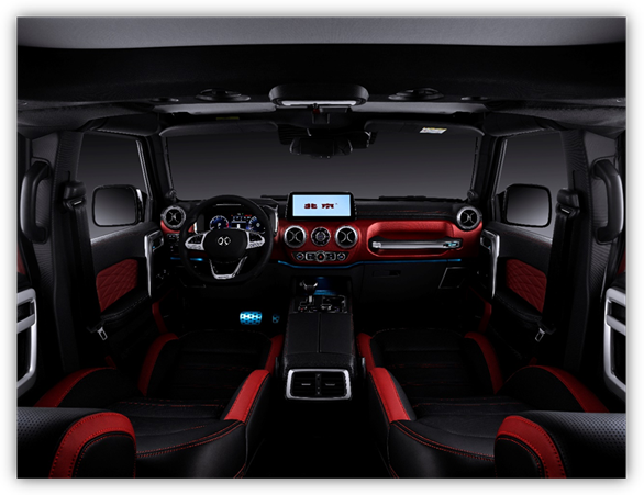 打开北京(BJ)40 PLUS的车门,映入眼帘的是红黑撞色、加镀铬装饰的豪华车内饰风格:有着颠覆越野车传统的中控设计、7寸中控屏、10寸电容触控屏、视野更开阔更清楚的流媒体后视镜、12.3寸超大仪表盘,除了大幅增强了科技感,同时三屏还可以互动,进一步增加了行车安全。除此之外,北京(BJ)40 PLUS还装备了车载WIFI、智能语音、导航、一键启动、电子手刹和自动驻车等多种辅助设备,可以令“小白”也能轻松应付专业越野路面的挑战。尤其是新的中控台上部悬浮式7英寸中控屏,集成了空调、多媒体、GPS导航以及座椅加热控制等功能,令整车科技感进一步提升。