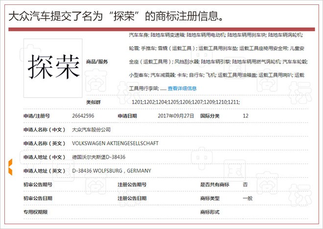 在3月23日举办的大众品牌战略发布会上,大众带来旗下五款全新SUV车型,新车的发布标志着大众在华正式开启SUV之年。近日,从国家工商行政管理总局商标局了解到,大众汽车正式提交了“探荣”的商标注册,从其命名体系来看,这有望是一汽-大众第二款中级SUV的产品名称。新车在产品定位上与途观L基本一致,车身尺寸也将基本相仿。