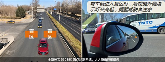 不过在主动安全方面,全新绅宝D50相比吉利全新帝豪,强得可不是一星半点,不提360度全景影像、MOD动态目标识别、LDW车道偏离、弯道辅助预警等配置的超越,只一项BSD盲区监测系统,就可以让“盲点不盲”,使车主出行更加安全。