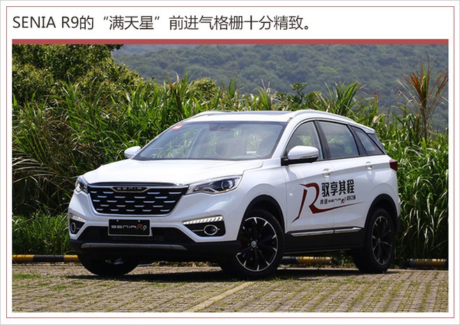 外观方面,SENIA R9前脸采用满天星进气格栅,上方镀铬饰条与两侧律动式LED前大灯搭配,尽显运动风范;发动机盖上线条凌厉并向中间延伸,充满力量感。前保险杠造型较为繁琐,两侧大面积黑色饰板内部嵌入圆形雾灯,配以上方LED日间行车灯,整体运动感十足。