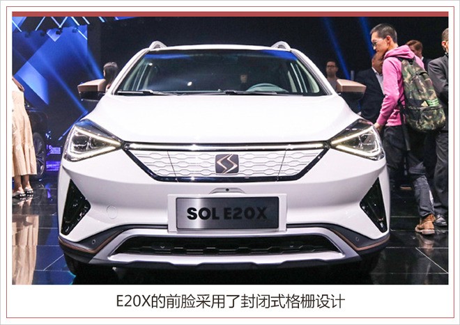 E20X的外观基于江淮iEV7S进行升级,前脸采用了封闭式格栅设计,前方“闪电”LOGO处为充电接口;两侧大灯组造型犀利并进行熏黑处理,下方LED日间行车灯带点亮后非常醒目。新车前保险杠造型凌厉,两侧黑色面板内配有雾灯,底部黑色贯穿式格栅周围和两侧带有镀铬及金色饰条,整体更显运动感。