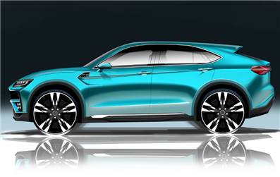 从效果图中,车身侧面最吸引人的就是两个超级大的轮毂设计,当然这也仅仅是在效果图中,未来量产肯定会更符合用车环境,轮毂样式可能会参考效果图中的多辐铝合金双色轮毂。倾斜度较大的后风挡玻璃配合上窄下宽的车身比例让这台车看起来更有轿跑SUV的风格,车身腰线更是从前翼子板通风口一直延伸至车尾灯,增添了整个车身侧面的力量感,短前悬长后悬让整车看起来极具动感。