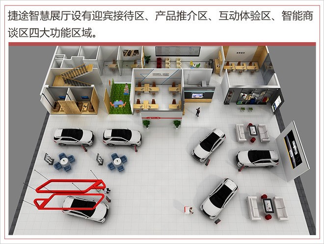 捷途智慧展厅将以“客户愉悦体验的触点满足”为目标打造,在体现科技感的同时,还兼具了开放性、社交性以及多元性。捷途未来将掌握和用户直接接触的触点,打破传统4S店经营模式。