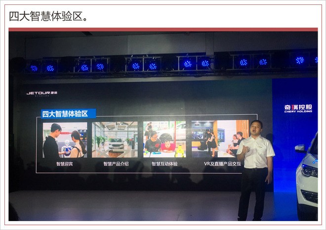 捷途智慧展厅设有迎宾接待区、产品推介区、互动体验区、智能商谈区四大功能区域。一方面展示了捷途最新的产品和技术,通过智能化科技解决和满足用户对产品信息、体验、DIY的疑惑和需求;另一方面则是通过智能直播,了解汽车生产工艺和制造技术,增加购车信心。