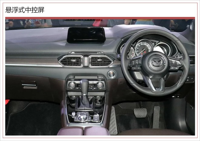 参考海外版车型内饰,CX-8方向盘采用三辐式造型,下方及周围带有镀铬饰条点缀,更显精致感;前方三炮筒式仪表盘设计简洁,功能区域划分清晰。中控台整体造型平直,空调出风口加以镀铬装饰点缀,底部为空调控制旋钮。此外,新车挡把区域后方配有旋钮式多媒体控制机构,右侧带有电子手刹和自动驻车等配置。
