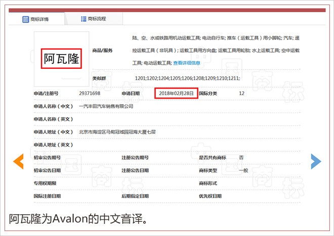 关于这款旗舰车型将取代皇冠旗舰地位的说法从未停息。网通社从中国商标网获悉:一汽丰田在国内注册了“阿瓦隆”的商标。该名称为Avalon的中文音译版,也就是说,这款将于2019年引入国内的旗舰车型有望定名为阿瓦隆。