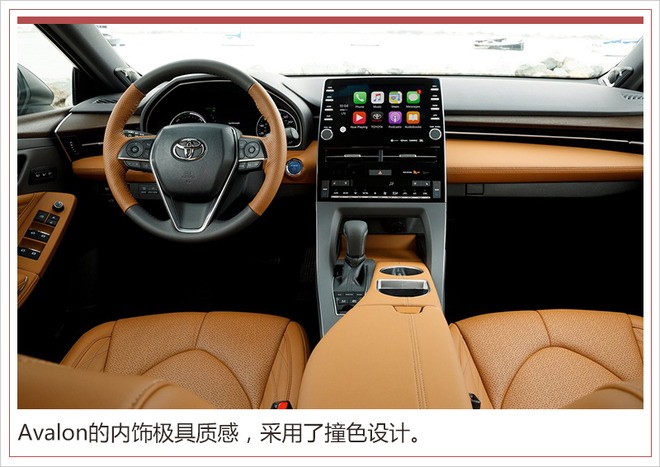 全新一代Avalon提供双色内饰设计,中控台层次分明。9英寸多媒体触控大屏支持苹果CarPlay功能,并与下方空调出风口、空调系统控制面板连成一体。多功能方向盘采用真皮包裹;仪表盘两侧为传统的指针式设计,中央配有大尺寸液晶显示屏。此外,新车还配备了HUD抬头显示功能和车道保持、车道偏离预警等主动安全系统。