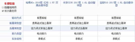 在底盘方面,三者的表现相差无几,前置前驱的驱动方式以及前麦弗逊式独立悬架保持一致,在后悬挂上,哈弗H2s和宝骏510采用的是小型车常用的扭力梁式的非独立悬架,长安CS35采用的是扭力梁式后悬挂,尽管叫法不同,但是扭力梁式的后悬挂在结构和性能上大致类似,并没有独立与非独立悬架之分。
