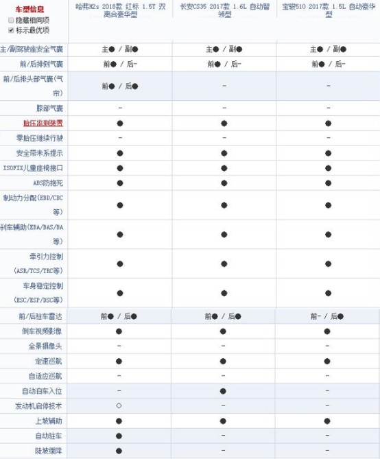 说起配置不得不提安全,哈弗H2s、长安CS35以及宝骏510都配备了侧气囊、胎压检测系统、ABS防抱死系统、EBD制动力分配、EBA刹车辅助、TCS牵引力控制、ESP车身稳定系统等配置。