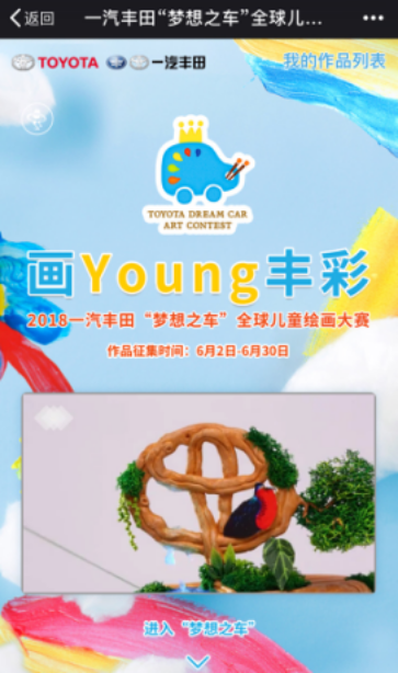 本次绘画大赛自招募伊始便受到了家长及儿童的广泛关注,活动中采用“线下体验+线上互动”的参赛模式,最大限度地将孩子们的参赛积极性调动了起来。而作为赛事体制中的一个亮点,应运而生的活动报名H5,通过其新颖的方式与良好的互动性,在增加活动趣味性、公正性、透明性等的同时,赢得了来自全国各地的参赛儿童及家长的极大好评。一汽丰田以儿童的汽车梦想为中心,以“画Young丰彩”为切入点,结合线上互动体验以及线下到店参与的方式,让一汽丰田能够帮助更多的孩子在造梦、绘梦路上越走越远。这种新颖的模式,更是在短短的24小时内收集到了1200多幅参赛画作,不得不说,这也是一汽丰田在“梦想之车”全球儿童绘画大赛上的一次创举。