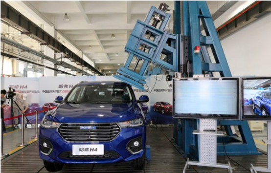 耳听为虚,说的再多不如亲眼看一下,为此哈弗H4接受了美国IIHS标准的车顶抗压测试。该测试是将车辆的金属压板以一定速度撞击车顶单侧的侧表面,然后基于试验过程中压板位移量127mm范围内测得的峰值载荷与车重(整车质量状态)之比(SWR)进行评价。