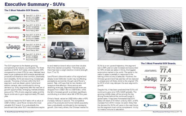 2017年,在国际著名品牌评估机构Brand Finance发布的“2017全球专业SUV品牌力”排名中,哈弗品牌力超越其他自主品牌及众多合资品牌,品牌等级AA+。在“中国SUV品牌强度”排名中,哈弗力压群雄。