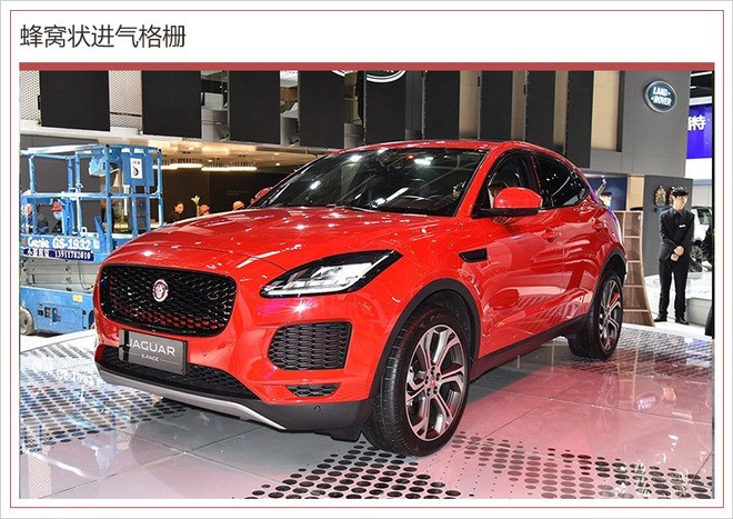 捷豹国产E-PACE整体造型圆润饱满,车头采用蜂窝状进气格栅且周围带有黑色饰条点缀,红色“豹头”标识置入格栅中央,具有辨识度;新车两侧头灯造型犀利,灯组内部LED光源配以下方日间行车灯,显得很有冲击力。此外,E-PACE下方梯形格栅及两侧进气造型均采用蜂窝样式,同时底部银色护板更显运动。
