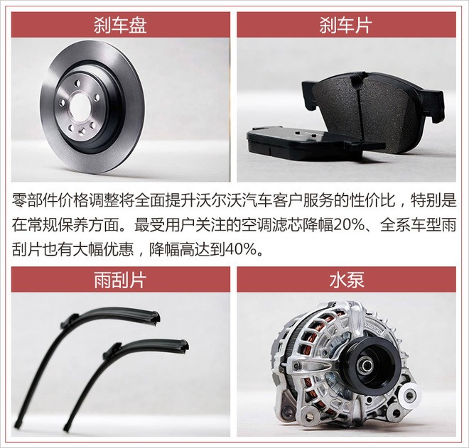此次零部件价格调整将全面提升沃尔沃汽车客户服务的性价比。特别是在常规保养方面,最受用户关注的空调滤芯降幅20%、全系车型雨刮片也有大幅优惠,降幅高达到40%。