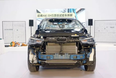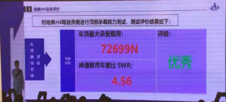 作为自主品牌中首次公开挑战IIHS顶压测试的车型,哈弗H4的表现可谓惊艳全场。在顶压测试中,金属压板会以一定速度撞击车顶单侧的侧表面,然后基于试验过程中压板位移量127mm范围内测得的峰值载荷与车重(整车质量状态)之比(SWR)进行评价。最终哈弗H4的车顶最大承受载荷是72699N,峰值载荷重比SWR是4.56,获得了“优秀”评级。