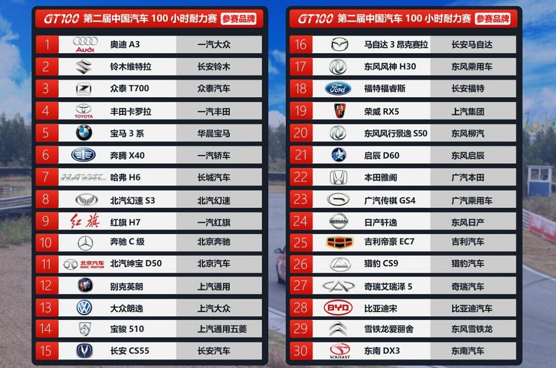 第二届中国汽车100小时耐力赛(GT100)将有30个国内外知名汽车品牌参加。赛事组委会7月5日在深圳举办的“第二届中国汽车100小时耐力赛参赛汽车品牌发布会暨与山东世屹集团进行战略合作的签约仪式”上发布了这30个参赛汽车品牌名单。其中,其中自主品牌18个,合资品牌12个,它们分别是: