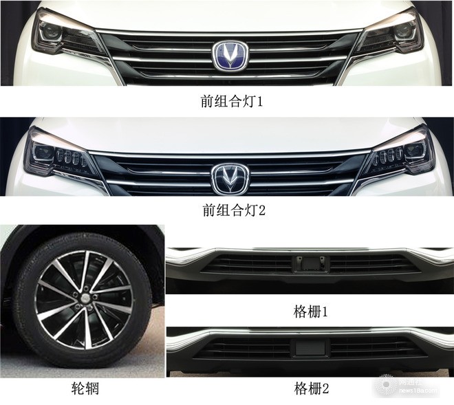 CS85可选装前排侧安全气囊、前后排一体式侧安全气帘、前大灯、前雾灯装饰件、不同样式进气格栅、天窗、不同样式轮圈、行李架、倒车摄像头等。