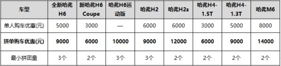 第一重好礼是拼团优惠。活动期间,登陆官方活动页面(https://pin.haval.com.cn/),发起拼团或直接参加拼团,购买指定车型,达到最小拼团量,即可享拼单购车优惠。详见下表。