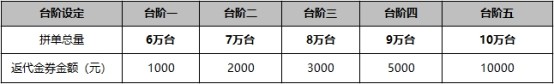 第二重好礼是销量达标再返代金券。活动结束后,拼购车总量达到指定不同量级,再返不同金额代金券。代金券可用于华为P20 Pro、高端太阳膜、行车记录仪等精品和延保产品等消费使用。详见下表。