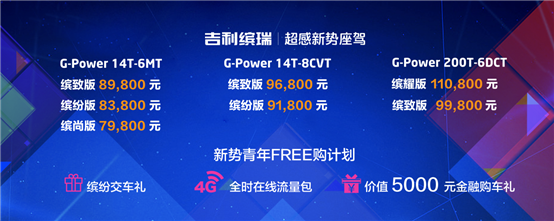 同时,吉利汽车还推出了“新势青年购车计划”,凡购买吉利缤瑞的用户均可享受专属缤纷交车礼、2年免费4G全时在线流量包以及最高5000元的金融购车礼。