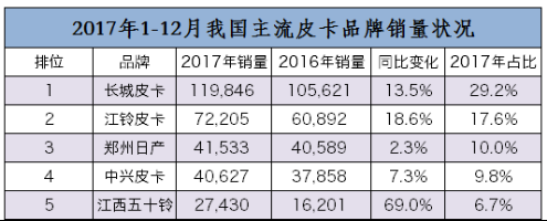 在中国皮卡发展史中,长城、江铃、中兴、黄海曾作为自主皮卡界的“四大天王”鼎力存在,随着市场的大浪淘沙,长城皮卡逐渐凸显,形成了一家独大的格局。2017年,长城皮卡的销量达到119846辆,比2016年增长13.5%,成为2017年唯一一家年销售量超过10万台的皮卡车企,继续稳居行业老大,地位难以撼动。刚刚过去的8月,长城皮卡更是在皮卡销量淡季,以单月售出10365台的成绩,再度问鼎。