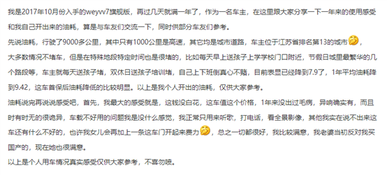 作为WEY品牌问世的首款车型,VV7一直被费油的舆论所困扰。出于好奇,小编我还专门跑到汽车之家论坛扒了扒,车主们果然很热情,分享了好多用车感受,好多VV7认证车主也分享了自己的油耗情况,然而,给出的答案却与网上高油耗的舆论截然相反。