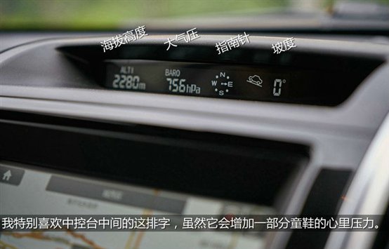 中控台上方的显示屏还能显示海拔高度、气压、指南针和车辆角度等信息,从此刻开始,这一路我们随时盯着它,生怕错过任何一个值得惊呼的数字。