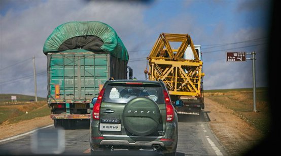 前往拉萨方向的大货车都是满载的…每当上坡他们就跟走不动一样,然而H9在高原上的动力衰减还是不大的,一但涡轮介入,动力就传递到四只车轮上,超车无比轻松。
