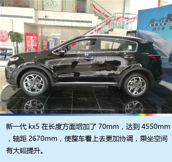 新一代KX5长宽高尺寸分别为4550/1855/1645,轴距为2670mm。轮圈有18寸和17寸的铝合金轮圈两款。