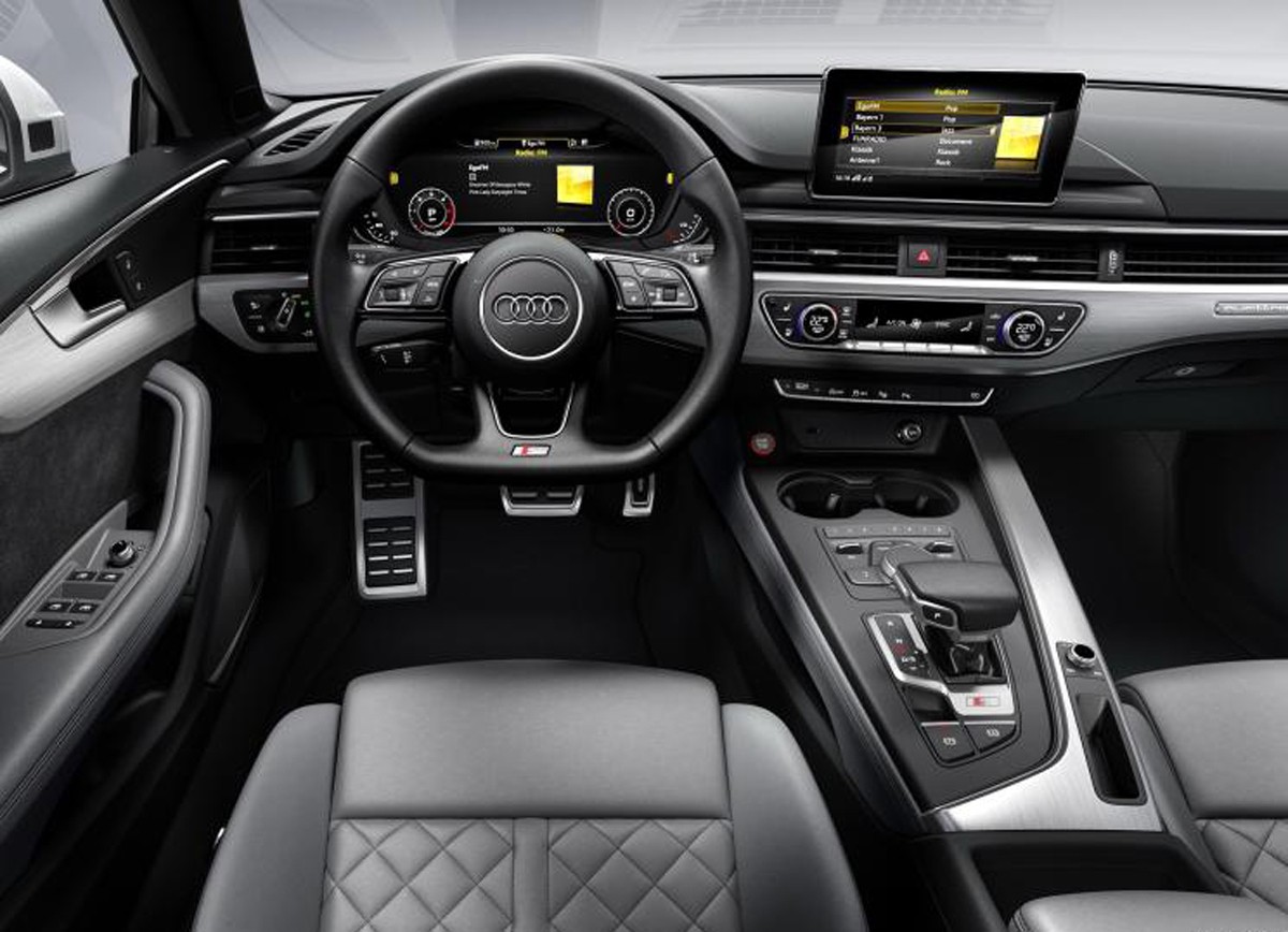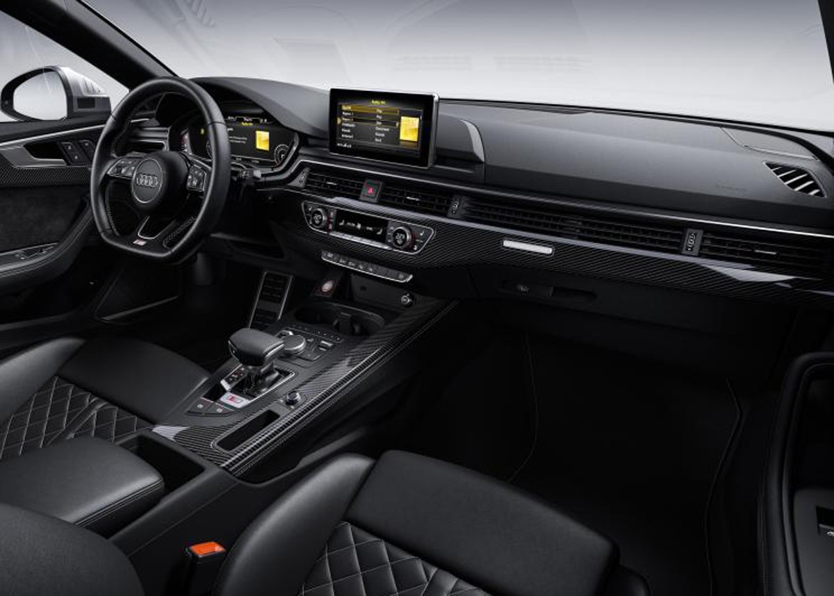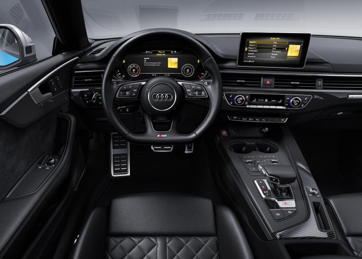 奥迪S5的MMI系统提供手机互联和自然语音识别功能,同时可选装的奥迪虚拟座舱还将提供12.3英寸全液晶仪表盘和增强型MMI导航等。此外,4G-LTE网络、Wi-Fi热点、交通信息、远程控制(my Audi手机App软件)、3D环绕声Bang & Olufsen音响系统、无线充电板等功能在新车上也有配备。
