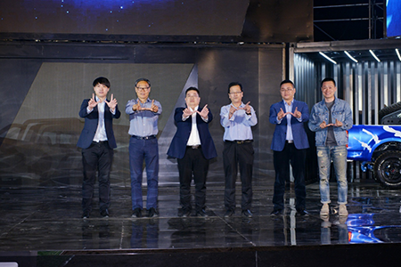 副秘书长罗磊、长城皮卡品牌总监张昊保、全国乘用车市场信息联席会秘书长崔东树、长城皮卡销售总监杨旭、资深媒体人吴佩共同启动“蓝风体验营”活动)