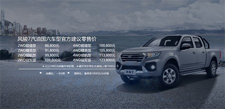 6月22日,长城皮卡风骏7汽油国六车型于石家庄上市,官方建议零售价8.68万元起。即日起购买长城皮卡全系车型均可享受“2000元抵4000元”现金礼、“最高3000元置换补贴”、“3000元金融贴息”等购车优惠。