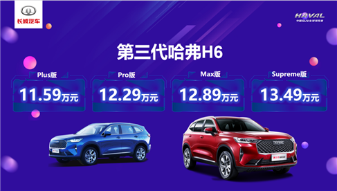 作为哈弗SUV的全新扛鼎车型,第三代哈弗H6传承品牌卓越造车基因,并以眺望未来的神车风范,领先不止一代。此次第三代哈弗H6上市的4款车型包括Plus版、Pro版、Max版、Supreme版,厂商建议零售价格分别为11.59万元、12.29万元、12.89万元、13.49万元。