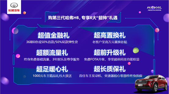 打破合资不合理溢价,实打实的售价,让众媒体及众网友纷纷为第三代哈弗 H6 点赞,而6大“超神”礼遇金融政策的推出,则让用户进一步感受了“国货之光”第三代哈弗 H6 的满满诚意。6大“超神”礼遇金融政策包括:超值金融礼,36期0息或50%首款/50%尾款弹性贷;超高置换礼,老客户至高万元置换补贴;超额流量礼,终身免费基础流量,3年娱乐及尊享服务;超前升级礼,免费FOTA升级,享受超前科技功能权益;超足暖心礼,1000元车主精品礼包大放送;超长质保礼,首任车主发动机、变速器核心零部件终身质保。