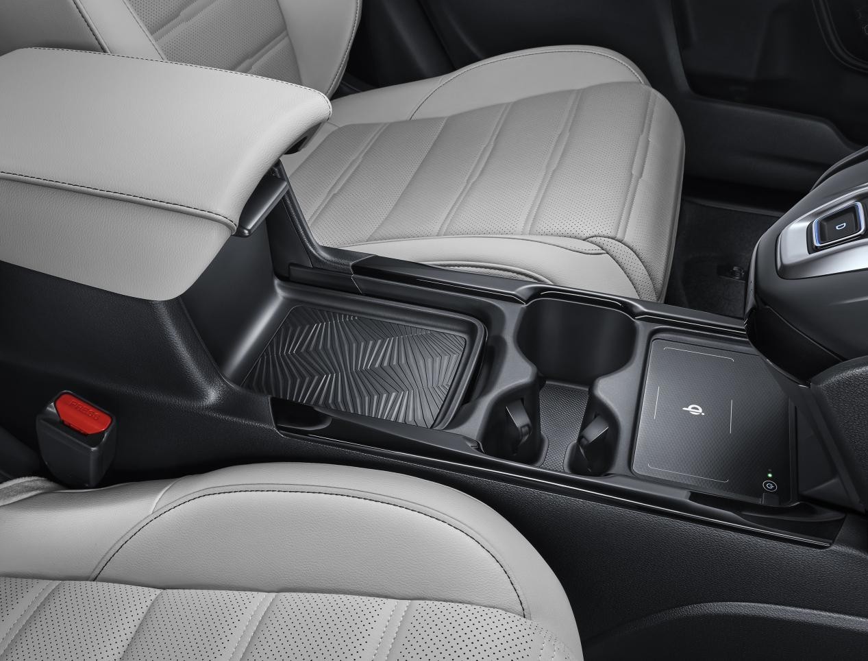 其二,在空间利用率上,CR-V的表现也几乎可以用“无死角”来形容。举一个简单的例子:前排中央扶手区域,由前及后无线充电面板、双杯架、大面积储物面板、扶手箱的布置错落有致且井井有条,满足实用性之余甚至还有一丝丝观赏性。