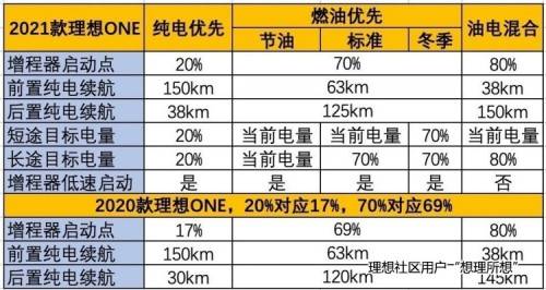 理想社区用户“想理所想”分享了选择理想ONE不同模式的基本原则:“日常用车能用纯电模式就用纯电模式,电到20%了会自动用油,动力也不会差多少。长途远行用燃油优先,节油模式先油后电,切换为纯电的时机就是要确保在能充电的地方前把电全部用完,先电后油也可以,只是动力会有略微下降。但在冬季,一定先油后电,可以用发动机余热额外再节约一些车内加热所需消耗的电量。”