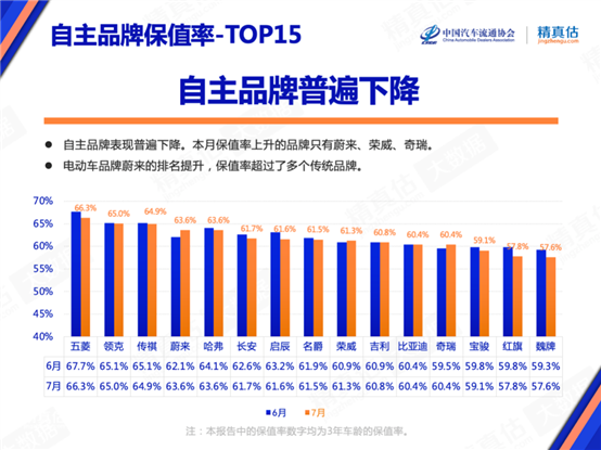 7月份,自主品牌保值率继6月后继续出现不同程度下滑,但中国荣威排名稳中有进,三年车龄的品牌保值率为61.3%,位列自主品牌榜单第9。
