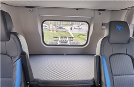 除了对发动机的升级,进一步提升运输效率节省运输成本以外,对于关乎驾乘者舒适性的车身模块升级也是欧航第三代产品的一大亮点。驾驶室空间方面,涉及升级的主要有两处,其中一处为后围外板及后顶盖向后部加长了70mm,卧铺宽度由620增加到近700mm;相应的车身空间由6.5m³增加到7.2m³ ,进一步提升了休息空间和舒适性。并且在下卧铺增加轻量化的储物箱体结构,既增大了储物空间又带来了轻量化。与此同时,下卧铺还可以继续扩展宽度至重卡牵引车级别的940mm,可同时满足两个人的躺卧需要。另一处升级为,将中间地板鼓包降低了108mm,鼓包处站立高度由1769mm增加到1877mm ,将中卡通过性和站立空间提高到了一个新的高度。